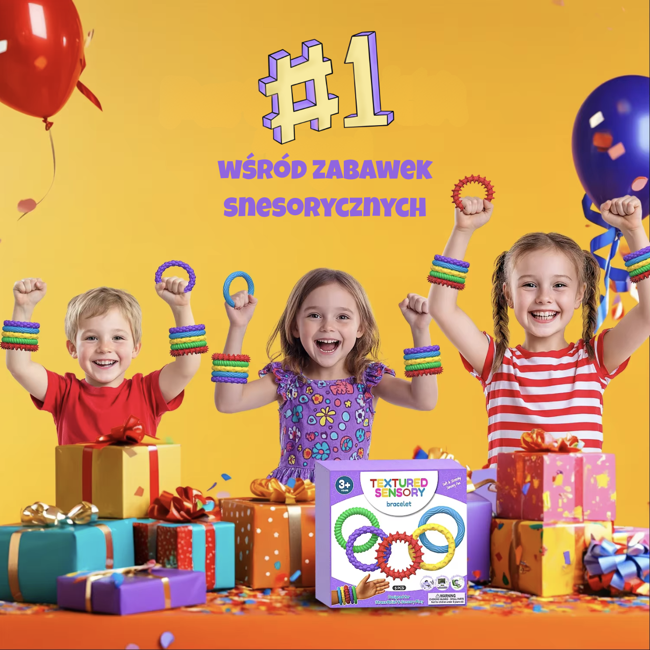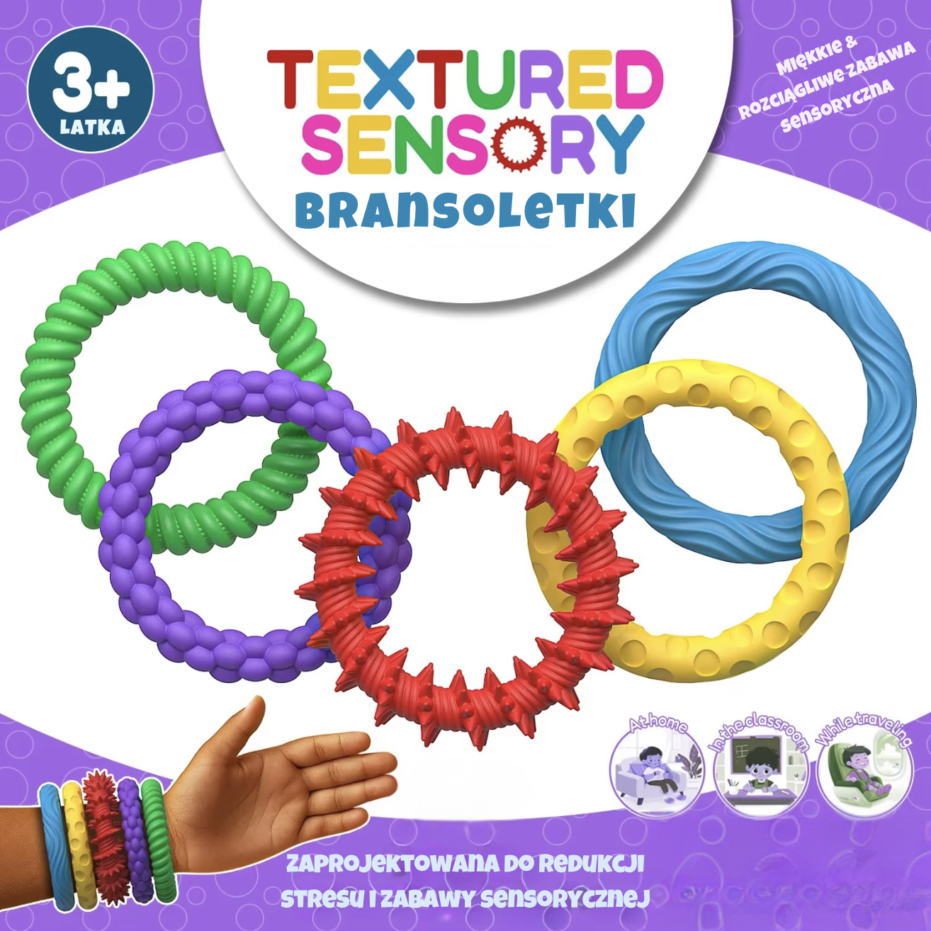 Poznaj Sensorki – miękkie, teksturowane bransoletki sensoryczne, które poprzez stymulację dotyku pomagają dzieciom wyciszyć się, rozładować stres i poprawić koncentrację 🎈