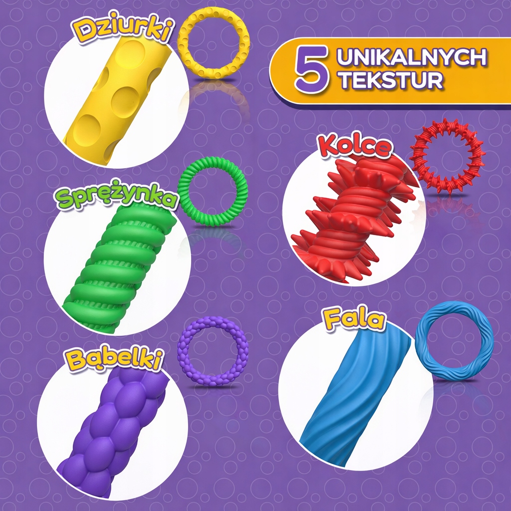 Poznaj Sensorki – miękkie, teksturowane bransoletki sensoryczne, które poprzez stymulację dotyku pomagają dzieciom wyciszyć się, rozładować stres i poprawić koncentrację 🎈