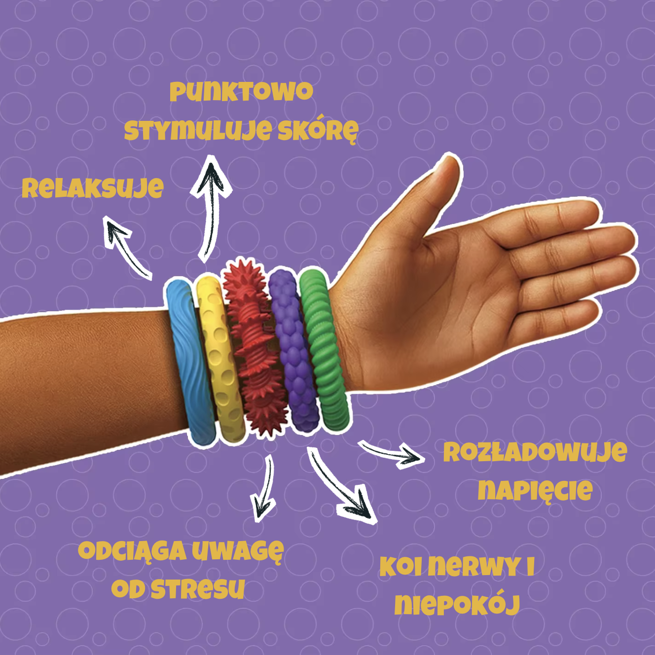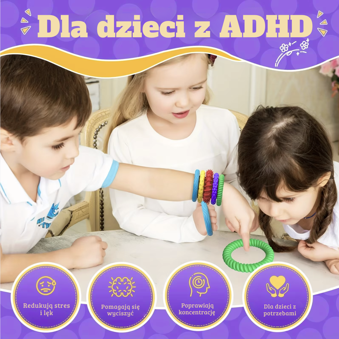 Rytmiczne ugniatanie i manipulowanie bransoletką pozwala dzieciom szybciej się wyciszyć i rozładować nagromadzone emocje.